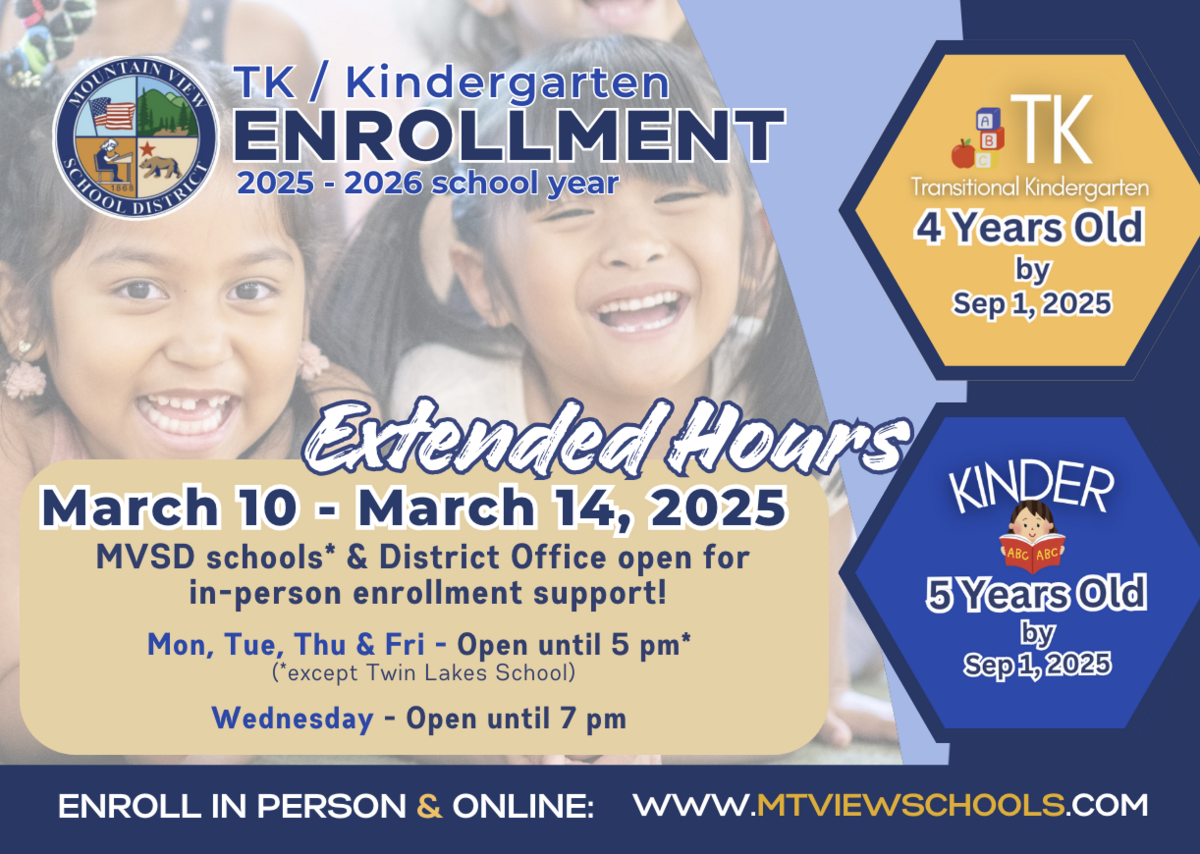 If you need assistance with your child's TK/Kinder enrollment, our school staff will be available to support our families for extended hours, in-person on the following days: