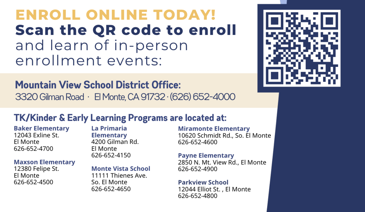 To access the online student enrollment process, click this link https://mountainviewesd.asp.aeries.net/air/. For more information or support with enrollment, please contact the Pupil Personnel Department at 626-652-4982.